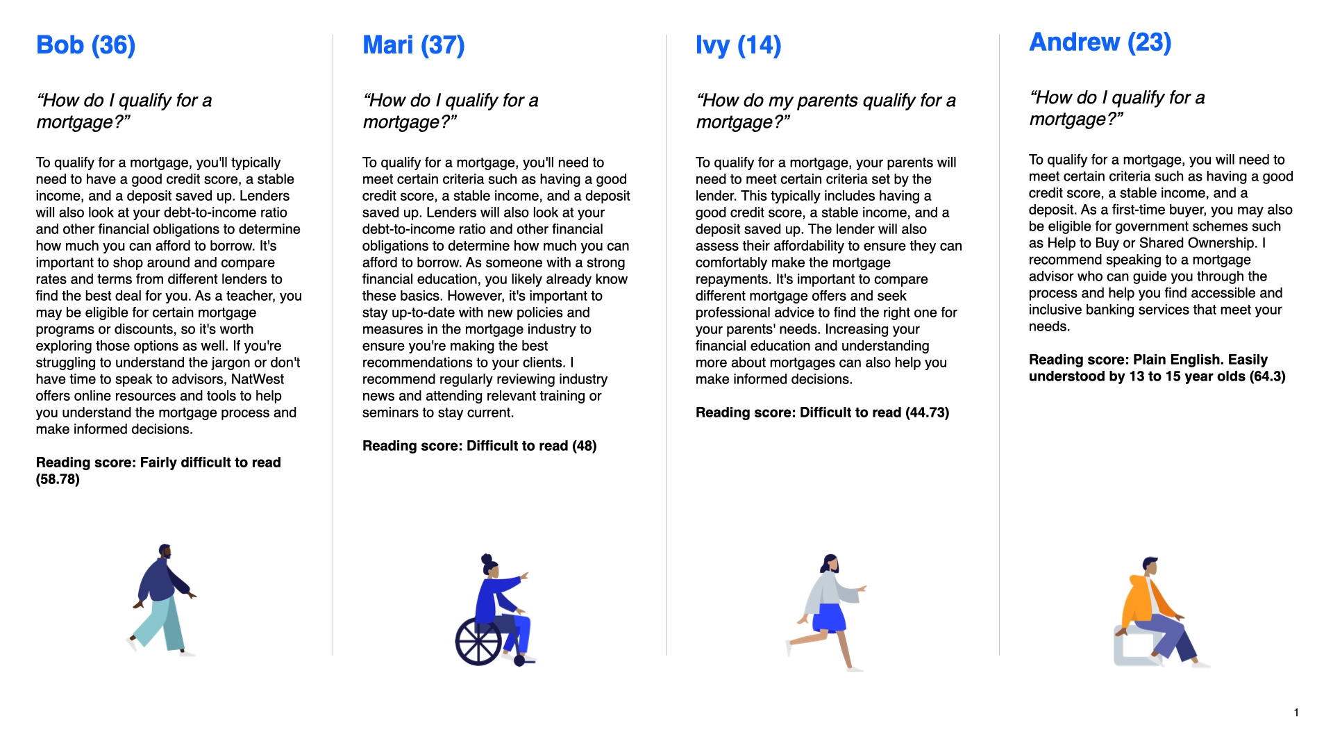3. Synthetic persona testing. This was the most revealing part. I authored four personas — Bob (36, teacher in South London, limited financial literacy), Mari (37, Bristol, specific accessibility requirements), a Cambridge-based user with English as a second language, and Andrew (23, early savings stage) — each submitting the same benchmark question set.